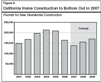 The budget’s forecast assumes that the recent economic slowdown will persist through the first half of 2007 before stabilizing real estate markets provide support for a mild upturn beginning in the second half of the year. The budget’s economic forecast for the nation and state is displayed in Figure 6. On an annual average basis, U.S. GDP growth is projected to slow from 3.3 percent in 2006 to 2.4 percent in 2007, before partially rebounding to 2.9 percent in 2008. The forecast assumes that U.S. inflation, as measured by the CPI, will slow from 3.2 percent in 2006 to annual increases of about 2 percent in both 2007 and 2008.
