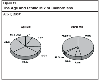 The implications of demographic trends for the budget depend not only on the total number of Californians, but also on their characteristics. California is well known for having one of the world’s most dynamic and diverse populations, including an increasingly rich ethnic mix and a large number of in-migrants. The state’s age and ethnic mix are shown in Figure 11.