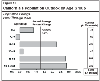 California’s continued population growth—including its age, ethnic, and migratory characteristics—can be expected to have many implications for the state’s economy and public services in 2007-08 and beyond. For example, strong growth of the 45-to-64 age group generally benefits tax revenues since this is the age category in which people normally earn their highest wages and salaries. Alternatively, the lack of growth statewide in the 5-to-17 age group translates into significant declines in enrollment for many school districts.