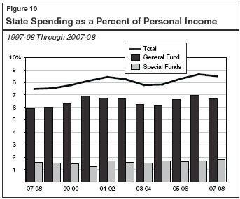 Spending Relative to the State’s Economy. Figure 10 shows how state spending has varied over recent years as a percentage of total California personal income (which is a broad indicator of the size of the state’s economy). From 1997-98 through 2001-02, total state spending increased steadily as a share of personal income—from 7.3 percent to 8.4 percent. As shown in the figure, growth in General Fund spending accounted for virtually all of this increase.