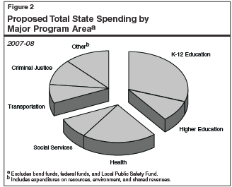 Figure 2 shows the allocation of the proposed $130.8 billion of total state spending in 2007-08 among the state’s major program areas. Both General Fund and special funds expenditures are included in order to provide a meaningful comparison of state support among broad program categories, since special funds provide the bulk of support in some areas (such as transportation).