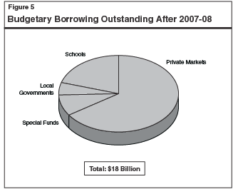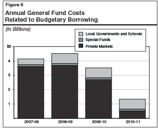 As shown in Figure 6, scheduled repayments of this budgetary borrowing will result in annual General Fund costs of $4.1 billion in 2007-08, rising to a peak of $4.5 billion in 2008-09. These repayment amounts are included in our projections. The significant decline in payments in 2010-11 is due to the administration’s assumption that the Proposition 57 deficit-financing bonds will be paid off in 2009-10.