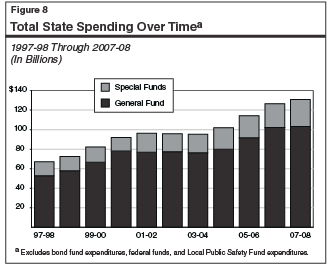 Total Spending. Figure 8 shows total state spending over the decade 1997-98 through 2007-08 (as proposed), and breaks down this spending according to General Fund and special funds spending. It indicates, for example, that total spending grows over this period from $67.1 billion to $130.8 billion.