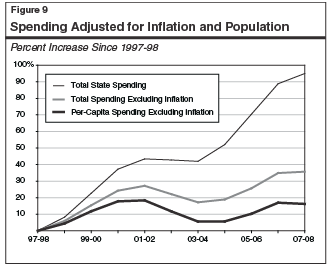 Real and Real Per-Capita Spending. Part of the spending growth discussed above is related to the effects of a growing population and rising prices over time. Figure 9 shows total state spending after adjusting for these factors. It indicates that: