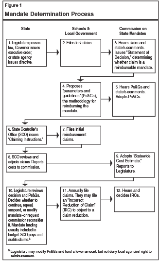 Figure 1 summarizes the full mandate process—from imposition of a state requirement (box 1) to payment of and adjustments to reimbursement claims (boxes 10-12). The steps in box 2 to box 9 commonly are referred to as the “mandate determination process,” because these are the steps in which the commission determines whether a requirement constitutes a state-reimbursable mandate and defines how the state requirement will be reimbursed.
