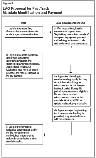 Figure 3 (next page) summarizes our proposed “fast track” process, and the responsibilities of the administration, local governments, and the Legislature. As can be seen, our alternative dispute resolution proposal is very similar to the administration’s proposal. Both allow for swift (possibly less than one year) settlement of mandate claims by bypassing the usual commission process. Both begin with negotiations between local governments and DOF—and culminate with the Legislature receiving a mandate identification proposal and simple payment methodology. Both proposals make the identified mandates subject to the payment requirements of Proposition 1A and allow them to be suspended by the Legislature pursuant to provisions of existing law. Finally, both approaches require local governments to withdraw any related mandate test claim if the Legislature provides the proposed funding.