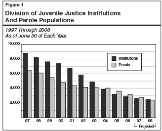 Juvenile Parole Population Decrease. As of June 30, 2006, CDCR supervised 3,162 youthful offenders on parole. The department forecasts the parole population will decrease to 2,405 by June 30, 2008, a projected two-year decrease of 757 parolees, or 24 percent. The projected decrease is the result of a continuing trend of declining admissions to youth correctional facilities. As Figure 1 shows, while the parole population is now slightly greater than the institution population, the administration’s budget plan assumes that the institution population will slightly exceed the number of juveniles on parole caseloads by the end of 2007-08. The significant continued decline in the numbers of wards under parole supervision is primarily a result of the declining rate of new admissions into DJJ youth correctional facilities.
