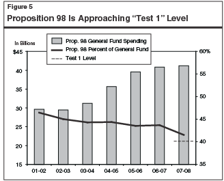 Test 1 on the Horizon. Figure 6 summarizes the factors that would contribute to Test 1 becoming operative. Based on the Governor’s proposed level of spending and our estimates for revenues, attendance, and local property taxes in the future, we project that Test 1 may become operative again as early as 2009-10.