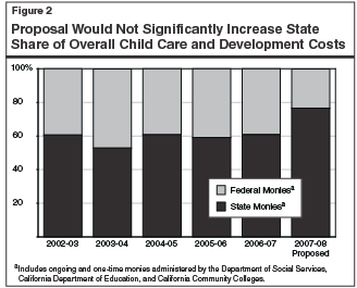 Governor’s Proposal Achieves Sizeable General Fund Savings Without Risk. Since the initial implementation of Proposition 98, child care has been deemed a legal and appropriate Proposition 98 expenditure. Moreover, even since the inception of CalWORKs Stage 2 in 1997-98, the state has chosen to designate Proposition 98 monies to cover a portion of the associated costs. In short, the Governor’s proposal does not deviate from common practice. Additionally, as shown in Figure 2, the Governor’s proposal would result in a relatively modest increase in the state’s share of overall child care and development costs—increasing from 61 percent of overall costs in 2006-07 to 77 percent in 2007-08.