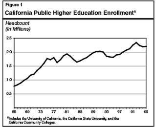 Headcount measures are useful for indicating how many individuals are participating in higher education at a given point in time. For example, in fall 2005 approximately 2.2 million students (headcount) were enrolled either full-time or part-time at UC, CSU, and CCC. Figure 1 summarizes actual headcount enrollment for the past 40 years. The figure shows that enrollment grew rapidly through 1975 and then fluctuated over the next two decades. Since 1995, enrollment grew steadily until a modest decline in 2003 and 2004, after which enrollment slightly increased. The recent decline in enrollment was largely made up of part-time community college students who were taking relatively few courses. Despite this drop in headcount, there was a much smaller decline in community college FTE enrollment. The remainder of this analysis focuses exclusively on enrollment growth funding for UC and CSU.