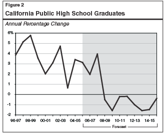 As discussed above, the state college-age population (18- to 24-year olds) is expected to shrink between 2014 and 2020. This downward trend reflects an anticipated reduction in the number of California public high school graduates starting prior to that time. As shown in Figure 2, the average growth rate in the number of high school graduates was relatively high in the past decade. Beginning in 2008-09, however, the size of this cohort is expected to decline. Between 2008-09 and 2015-16, the number of students graduating from the state’s high schools is projected to fall by roughly 26,000 students.