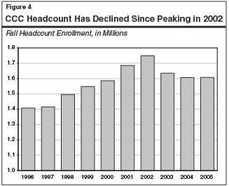 Enrollment Levels Up and Down. As shown in Figure 4, headcount enrollment (the number of individual part-time and full-time students attending a community college) is about 200,000 students higher than a decade ago. Growth has been uneven, fluctuating on a year-to-year basis. Enrollment peaked in fall 2002, but since then has declined by about 8 percent (140,000 students). During the same period, the college-age population (18- to 24-year olds) has grown by 5 percent, and the adult population (aged 25 to 64) has grown by 7 percent. As we discussed in our
