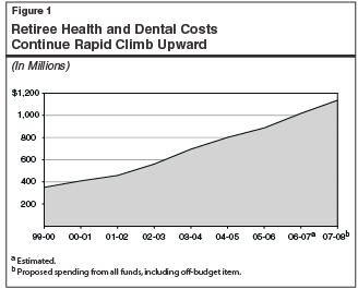 Budget Assumptions Appear to Be Somewhat Optimistic. Despite the lack of information from the administration, it is obvious that, in order for the Governor’s budget plan in this area to be achievable, CalPERS would have to negotiate lower rate increases and/or see a smaller increase in the net number of enrolled retirees and dependents receiving benefits than has typically been the case in recent years. Figure 1 shows the recent trend of steep spending increases for this item. While all funds in the budget plan would cover a 12 percent growth in retiree health and dental costs in 2007-08, the average annual rate of spending growth for this item actually has been 16 percent during the last seven years and 14 percent during the last three years. This spending growth results primarily from CalPERS’ premium increases, but also from growth in the population of retirees and dependents receiving benefits. If spending requirements for retiree health and dental benefits end up increasing 14 percent in 2007-08, for instance, instead of the 12 percent assumed in the Governor’s budget plan, the Legislature would need to appropriate about $25 million more than the amounts proposed by the administration.
