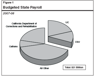 Compensation for state employees drives a significant portion of state government’s operating costs. The 2007-08 Governor’s Budget projects over $21 billion in salary and wage expenditures for 345,000 authorized personnel-years (PYs) in 2007-08 (including $6.7 billion and more than 120,000 PYs in higher education). Figure 1 displays a breakdown of these projected 2007-08 payroll expenses (excluding expenditures for benefits—such as health insurance and retirement). As shown in the figure, higher education—consisting of the University of California (UC) and California State