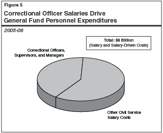 Decisions About Officer Pay Drive General Fund Personnel Costs. Figure 5 shows that salaries and related costs for the state’s correctional officers were the key component of civil service personnel expenditures paid from the General Fund in 2005-06. These funds paid to correctional officers, their supervisors, and managers totaled $3.4 billion—41 percent of all such General Fund costs.