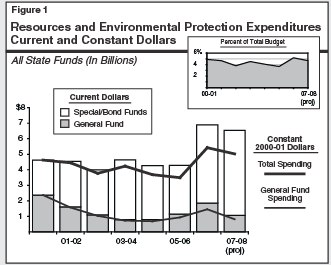 Expenditure Trends. Figure 1 shows that state expenditures for resources and environmental protection programs increased by about $1.9 billion since 2000-01, representing an average annual increase of about 5 percent. The increase between 2000-01 and 2007-08 reflects an increase in special fund and bond expenditures. On the other hand, the budget proposes General Fund expenditures for 2007-08 that are substantially below 2000-01 spending—a decrease of $1.3 billion.