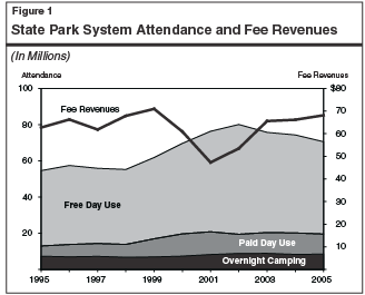 Direct an Increase in Park Fees to Fund Ongoing Maintenance. While the department faces a growing deferred maintenance problem—in part because its annual maintenance budget does not meet its estimated maintenance requirements—fee revenues collected by the department have remained relatively flat in recent years. In the late 1990s, the state dramatically reduced park fees. Beginning around 2002, fees were subsequently increased, but not to the previous level. Therefore, while paid attendance at state parks has consistently increased over time, fee revenues collected by the department are less now than they were in the late 1990s, as shown in Figure 1. From 1995 to 2005 (the last full year for which data are available), paid attendance in the state park system increased by 7.5 million visits. Over this period, however, total fee revenues collected increased by only $5.4 million. Total fee revenues actually declined by $0.75 per paid visit over this period (in nominal dollars). If one adjusts for inflation, fee revenues were almost $2 less per paid visit in 2005 than in 1995.