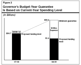 proposes to reduce current–year spending by $400 million. Figure 2 shows how the Governor's proposed funding level of $56.7 billion in 2007–08 results in a minimum guarantee of slightly more than $59.6 billion in 2008‑09. The figure also shows that the Governor's proposed funding level for 2008‑09—$55.6 billion—is around $4 billion less than his calculation of the guarantee. Funding at this lower level would require the Legislature to suspend the Proposition 98 requirement. Please see the