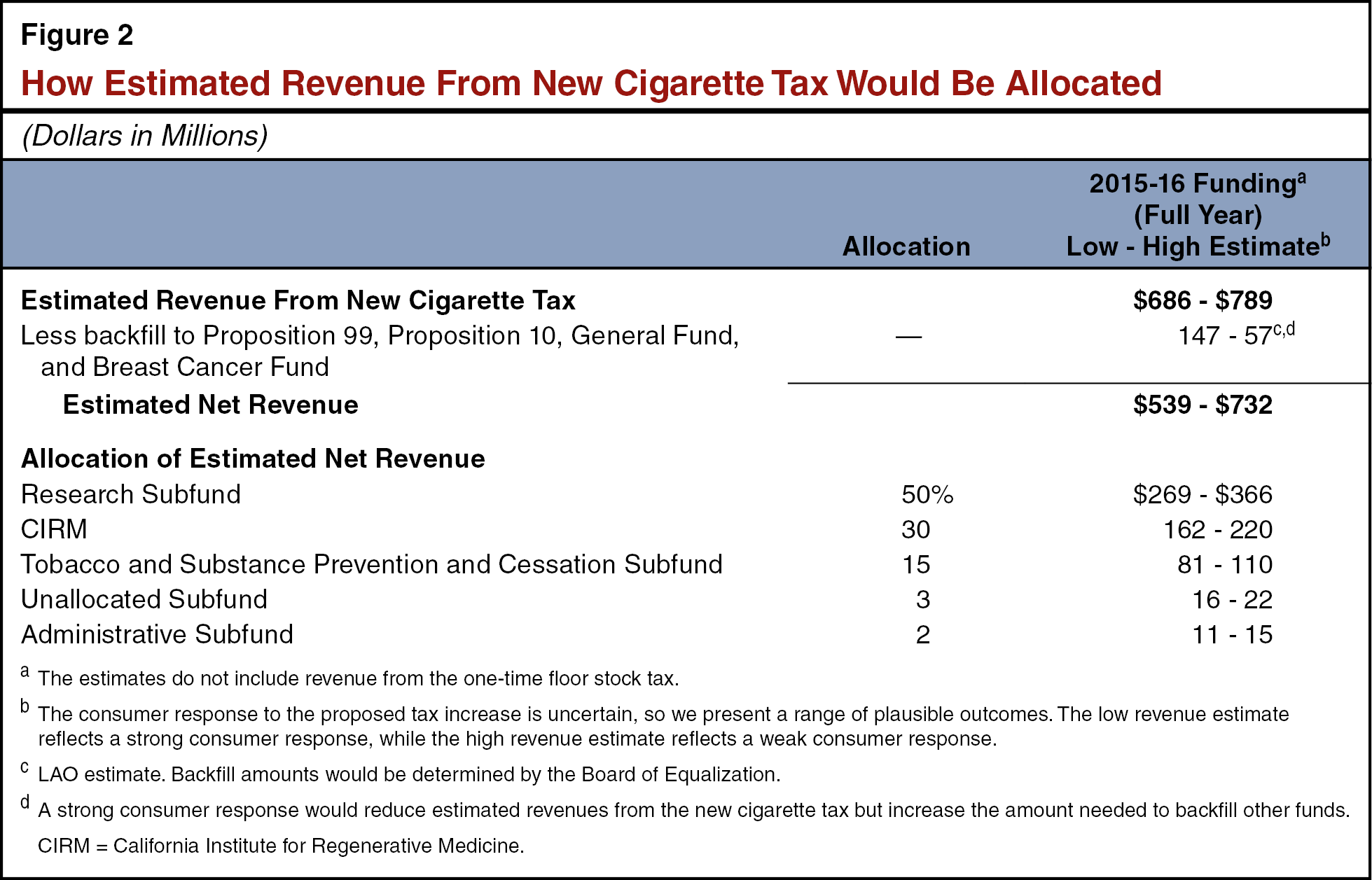 - Net increase in cigarette excise tax revenues in the range of